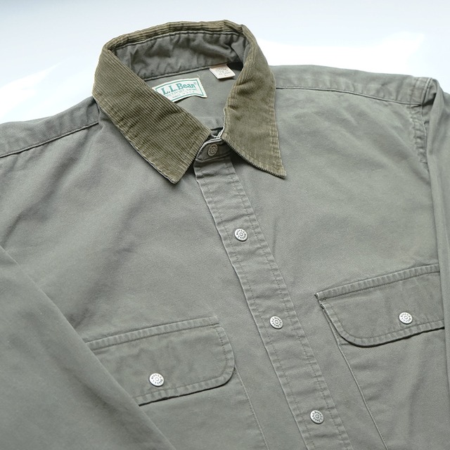 エルエルビーンのスナップボタンのシャツです。 薄いダック地のような生地で、襟や袖先がコーディロイが使われています。 胸ポケットもスナップ仕様。ボタンにはブランド名の刻印入り。 ハンティングジャケットっぽい雰囲気で、前開きで着るのもおすすめです。 左右、両袖とも折り目にそって色褪せがあります。 USA製 ◎サイズ Lサイズ 肩幅:48cm 身幅:60cm 着丈:70cm 袖丈:54cm ◎素材 コットン 100% ◎コンディション C 使用感はあまり感じられないのですが、両袖とも折り目が色褪せしています。 また左胸のポケットに小穴(ほつれ)があります。 ◎カラー ブラウン