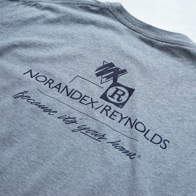 00年代頃の企業モノのポケットTシャツです。 NORANDEX REYNOLSは住宅などの建築資材メーカーのようですが、現在は全米最大の外装建材卸売業者に買収され社名も変更になった模様です。 胸とバックにロゴが入る、至ってシンプルなデザインですが、チノ系やアウトドア系のショーツとの相性は◎。 コンディションはややダメージがありますのでご注意ください。 ◎サイズ XL 肩幅:61cm 身幅:58cm 着丈:64cm 袖丈:17.5cm ◎素材 コットン 90% ポリエステル 10% ◎コンディション C 全体的に使用感があり、右胸に小穴、襟ぐり/ポケットの右側/裾/右腹部あたりに黄ばみのような薄いシミがあります。 ◎カラー グレー