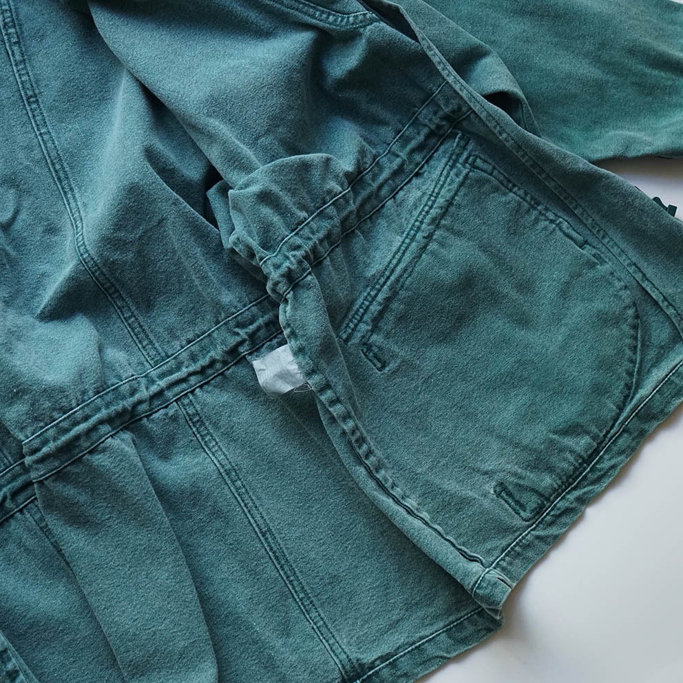 デニムのような生地で、グリーン×パープルの製品染めが毒々しくも、イカしています。