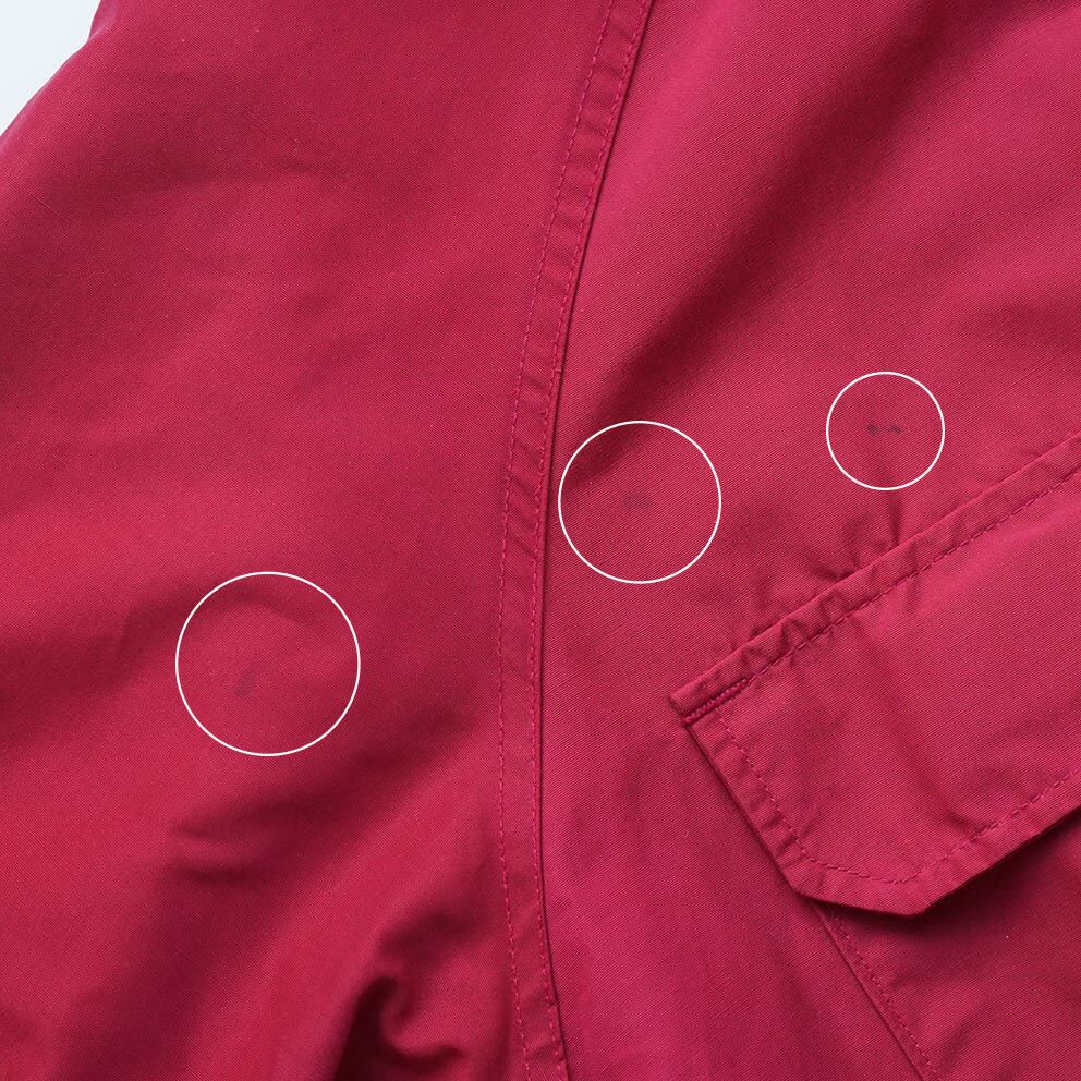 右ポケット部分に白いシミ(画像8、9枚目)があるほか、左胸あたりに黒い汚れ、裾部分の黒ずみなどあります。