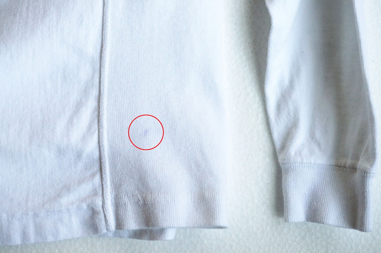 着用感は少ないですが、左のサイドリブに5mmほどの紫のシミがうっすらとあります。